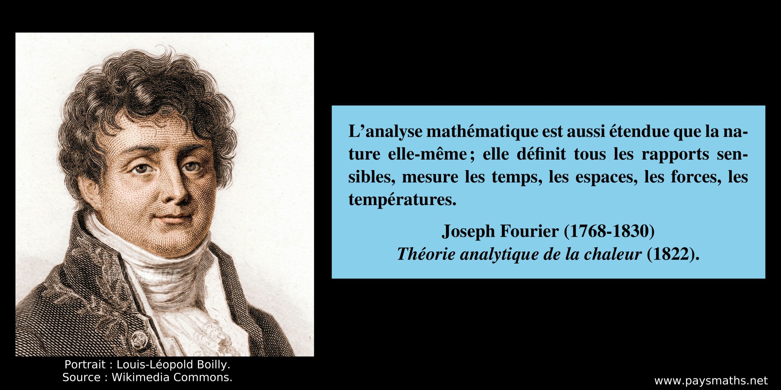 ![Portrait of Joseph Fourier, and a quote : "The analytical equations [...] which Descartes was the first to introduce into the study of curves and surfaces, are not restricted to the properties of figures, and to those properties which are the object of rational mechanics ; they extend to all general phenomena. There cannot be a language more universal and more simple, more free from errors and from obscurities, that is to say more worthy to express the invariable relations of natural things."](https://paysmaths.net/wp-content/uploads/2025/10/Joseph_Fourier-02en-1024x512.jpg)