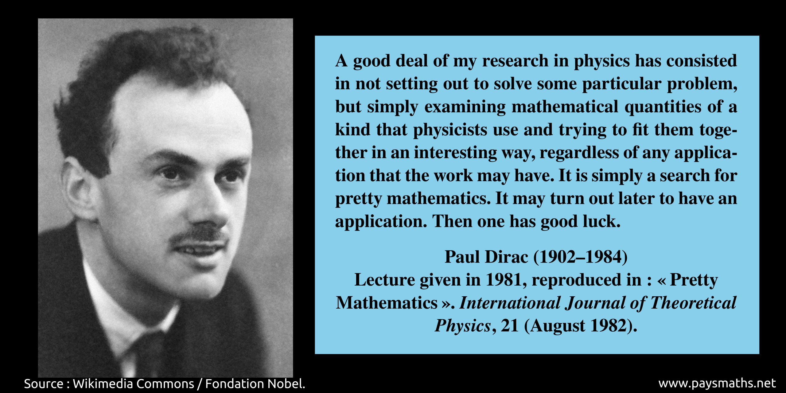 ![Portrait photographique de Werner Heisenberg, et une citation : "Il n'est pas surprenant que notre langage soit incapable de décrire les processus qui se produisent à l'intérieur des atomes, car [...] il a été inventé pour décrire les expériences de la vie quotidienne [...]. Heureusement, les mathématiques ne sont pas soumises à cette limitation, et il a été possible d'inventer un modèle mathématique – la théorie quantique – qui semble tout à fait adéquat pour le traitement des processus atomiques ; pour la visualisation, cependant, nous devons nous contenter de deux analogies incomplètes – l'image de l'onde et l'image du corpuscule."](https://paysmaths.net/wp-content/uploads/2025/11/Werner_Heisenberg-01-1024x512.png)